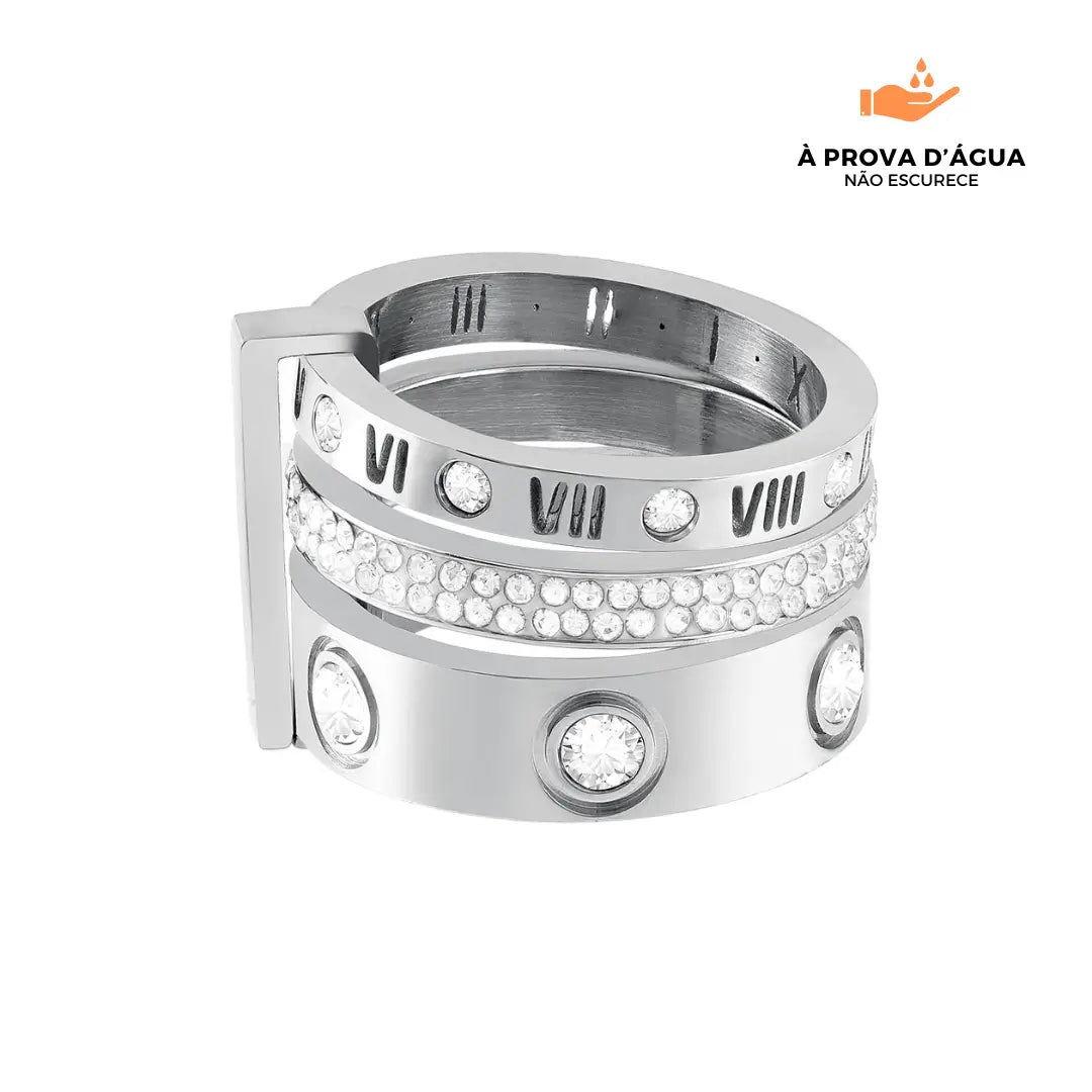 Esse é o Anel Triplo Glamour - uma combinação única de três anéis que se unem para criar uma peça deslumbrante e elegante.
