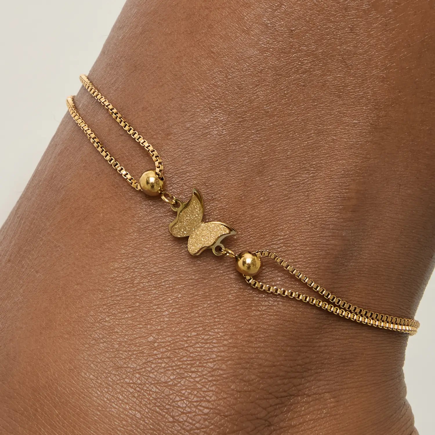 A Tornozeleira Borboleta Duo, com o simbolismo da borboleta, representa transformação e liberdade. Esta tornozeleira traz um charme único, realçando a beleza dos seus pés.